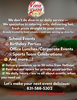 At Hollister Vivi's Sweet Tomato Pizza, we are passionate about creating the best pizza in town. Our founder, Juan Tapia started making pizzas in 2020 hi started from scratch adding a little bit of water little bit of flower, until I got the perfect mixture. I make everything fresh and it’s all based on my mother‘s recipe. I also make homemade Italian sausage then in 2022 We got the privilege to cook pizza for the schools in Hollister. We are fully dedicated to feeding Our children it is a honor and a blessing to be able to serve the public schools. home made pizza pizza party's caters pizza near ne